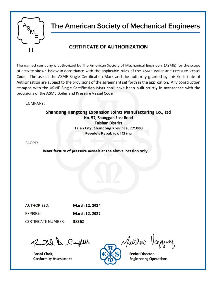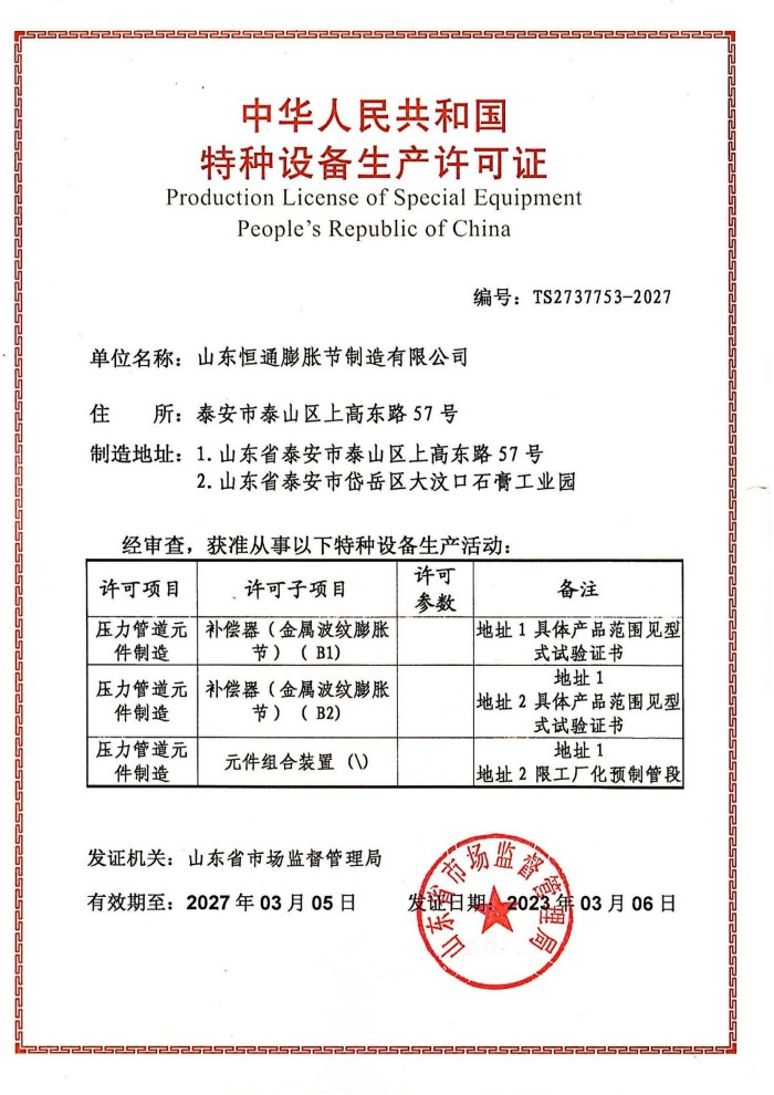 公司取得我國特種設(shè)備制造許可證、壓力容器A1級資質(zhì)、壓力管道元件A、B的資質(zhì),并且獲得了歐盟PED-CE認證、美國ASME“U”鋼印、ISO 9000質(zhì)量管理體系認證、GB/T 14000 環(huán)境管理體系認證及GB/T 45000 職業(yè)健康安全體系認證。膨脹節(jié)產(chǎn)品涵蓋壓力管道波紋膨脹節(jié)、壓力容器波形膨脹節(jié)、金屬波紋管、金屬軟管、聚四氟補償器、橡膠補償器及非金屬補償器等。